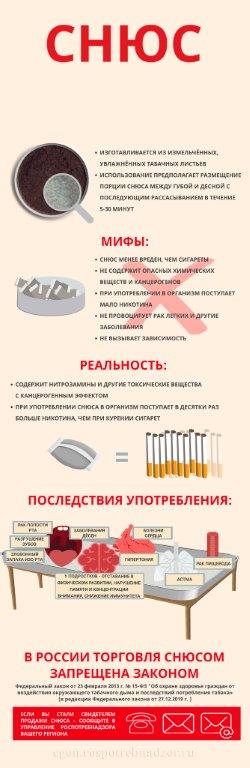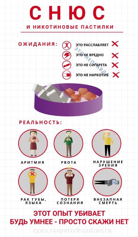 Снюс – один из видов бездымного табака. Почему этот продукт стал популярен и для чего продвигается табачными компаниями? Для того, чтобы человек мог получить очередную дозу никотина там, где курить нельзя (на дискотеках, мероприятиях, в ресторанах и самолётах). Никотин и другие вещества высвобождаются при рассасывании из снюса в слюну, при этом сразу попадают в кровоток, всасываясь через слизистую полости рта. Распространено заблуждение, что использование бездымного табака менее вредно, по сравнению с курением, поскольку он содержит менее опасные химические вещества. Это не так. В составе снюса содержится ряд химических веществ с потенциальным канцерогенным эффектом. Самые опасные из них- нитрозамины, они образуются при производстве снюса, в процессе ферментации табака. Доказано, что люди, которые употребляют снюс, фактически подвергаются воздействию более высоких уровней нитрозаминов и других токсичных веществ, нежели курильщики традиционных сигарет. Причина в том, что снюс остаётся во рту дольше, по сравнению с сигаретным дымом, соответственно, вредные химические вещества дольше воздействуют на организм. Хотя бездымный табак и содержит меньше количество канцерогенов по сравнению с сигаретами, это не аргумент в его пользу. Даже один единственный канцероген может вызывать мутации, приводящие к раку. ПОСЛЕДСТВИЯ УПОТРЕБЛЕНИЯ БЕЗДЫМНОГО ТАБАКА «Безвредность снюса»- опасное заблуждение! Употребление бездымного табака – доказанная причина развития рака полости рта, рака поджелудочной железы, рака пищевода, и рака лёгких. Длительное использование бездымного табака приводит к пародонтозу, разрушению зубов, появлению зловонного запаха изо рта, тахикардии, гипертонии. Потребители бездымного табака получают намного больше никотина по сравнению с курильщиками сигарет. Дело в том, что употребление снюса предполагает, что табак остаётся во рту не менее 30 минут, за это время в организм попадает в десятки раз больше никотина, нежели при выкуривании одной, даже самой крепкой сигареты. Если в самой крепкой сигарете содержится до 1,5 мг никотина, то при употреблении снюса можно получить до 22 мг никотина. Даже если табак находится в полости рта непродолжительное время, порядка 5-10 минут, в кровь все равно поступает большее количество никотина. Высокая концентрация никотина становится причиной быстрого развития толерантности, и практически молниеносного формирования зависимости. Отказ от использования снюса - процесс более тяжёлый, чем отказ от курения, зачастую невозможный без помощи специалиста и специального курса реабилитации. К сожалению, очень распространено использование снюса в подростковой и молодёжной среде, где он считается не только безопасным, но и модным. Последствия употребления снюса в подростковом возрасте крайне опасны: · отставание в физическом развитии · повышенная агрессивность и возбудимость; · ухудшение когнитивных процессов; · нарушение памяти и концентрации внимания; · высокий риск развития онкологических заболеваний, прежде всего желудка, печени, полости рта; · ослабление устойчивости к инфекционным заболеваниям. В России законодательно запрещена торговля насваем и снюсом, но появилась новая опасность- бестабачная никотиновая продукция, имитирующая пищевую. У школьников набирает популярност